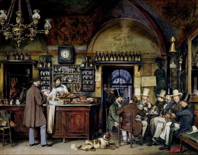 Non c’erano circoli o clubs», egli aggiunge, «e per una tradizione quasi secolare, si davano convegno al caffè Greco, in via Condotti, che era divenuto loro feudo e recapito, e campo chiuso delle loro dispute vivaci e iperboliche». E, prima di lui, Pascarella non aveva esitato ad affermare: «si può dire, senza esagerare, che fino al 1870 il Circolo artistico internazionale di Roma fu il Caffè Greco». Sembra però che, di quei tipici personaggi, pochi dessero commercio. Male comune a tutta la penisola, come avevano già osservato i De Goncourt: «Il caffè, in Italia, è luogo pubblico, in cui non si consuma niente». Sta di fatto che passò in proverbio, negli annali del caffè Greco, la consumazione tipica di quei bohémiens: «acqua di cannella e fuoco di padella». Cioè l’acqua della fontanina che butta tuttora nella prima saletta, sotto il telefono a gettone, e la padella, o «focone», che troppo spesso serviva soltanto a far accendere le pipe degli sfaccendati avventori. Tolleranti tradizioni del Greco nelle quali vanno ad inserirsi anche i molti «chiodi» piantati dagli artisti, a tutte spese delle varie gestioni del locale, dal Carnesecchi al Salvioni (che si fece una reputazione durante il blocco napoleonico, continuando a mescere, sia pure in misura minore del consueto, caffè genuino, mentre le altre botteghe non passavano che «cicoria»), dal Frezza ai Gubinelli, di cui avremmo occasione di parlare a lungo.